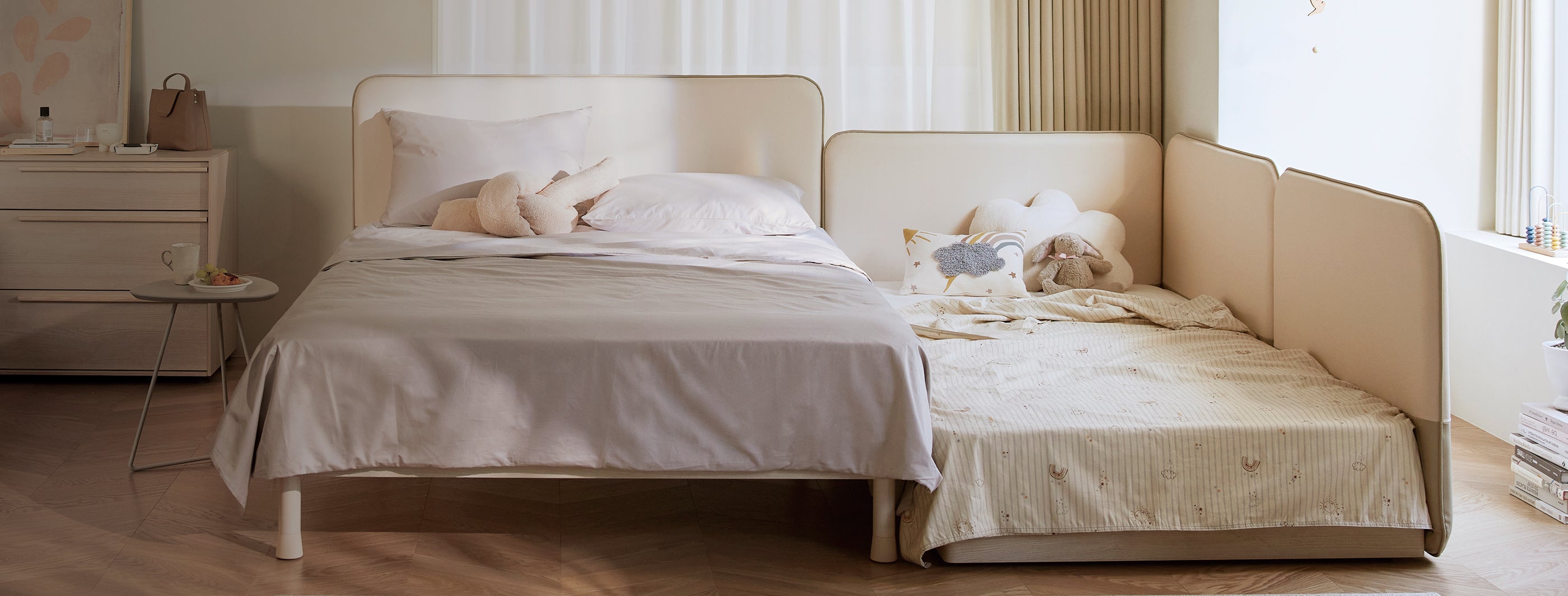 為滿足小孩與成人的多元需求,iloom 特別推出CUSINO 親子床組,提供有床腳與無床腳的選擇。無床腳設計方便兒童活動,而安裝床腳則可提升高度,適合成人使用,搭配護欄更添安全性。護欄採用柔軟材質並結合圓弧曲線收邊,不僅美觀,還可靈活組合,滿足不同使用需求,讓全家人享受舒適安心的睡眠體驗。