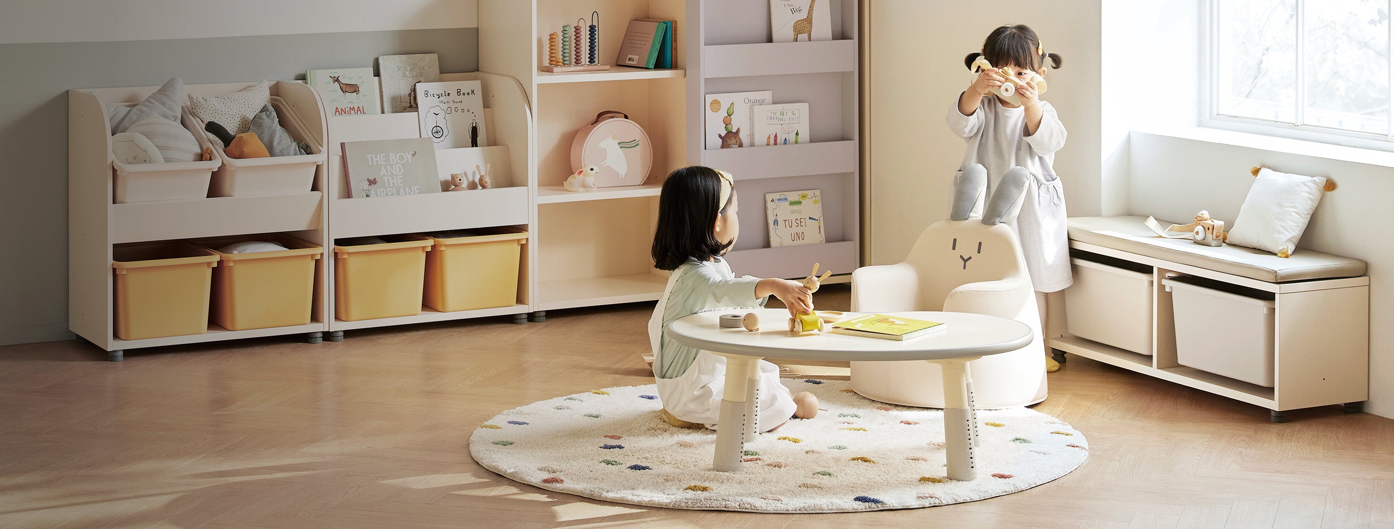 首先是地板的部分,地板的材質會建議選用質地比較軟的材質,例如:木地板,或鋪上柔軟的地毯、塑膠軟墊(巧拼地墊)等,防止孩子跑跳時碰撞受傷、跌倒,同時能避免孩子刮傷地板。