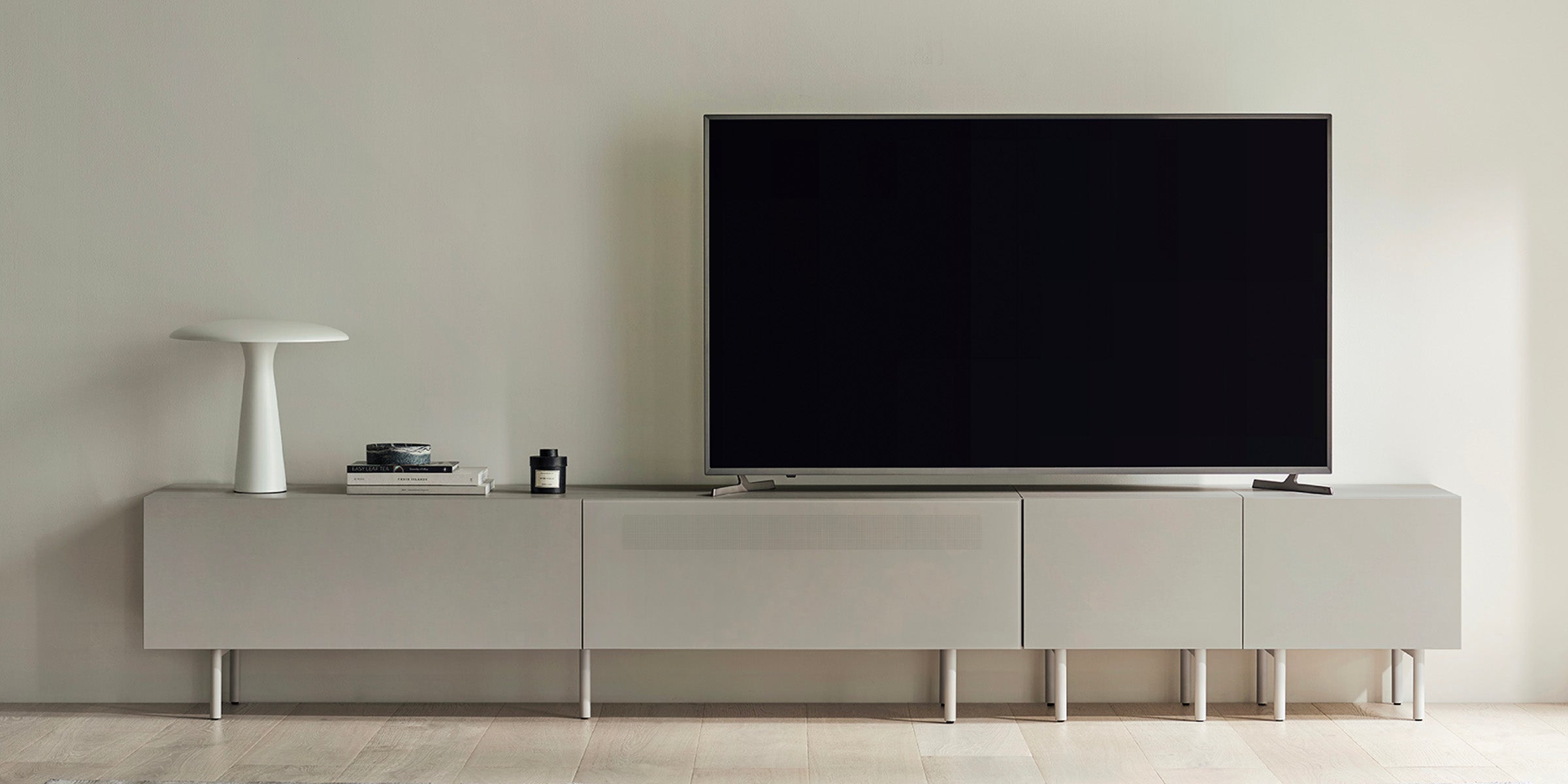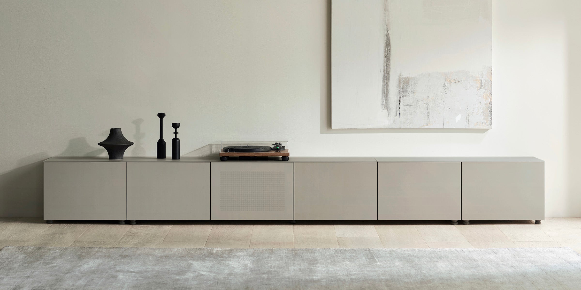 依照自家客廳格局,從基本模組(2000 型)起步,再搭配 500 型側櫃自由組合,便能靈活延展收納,同時營造出經典而富有空間感的氛圍