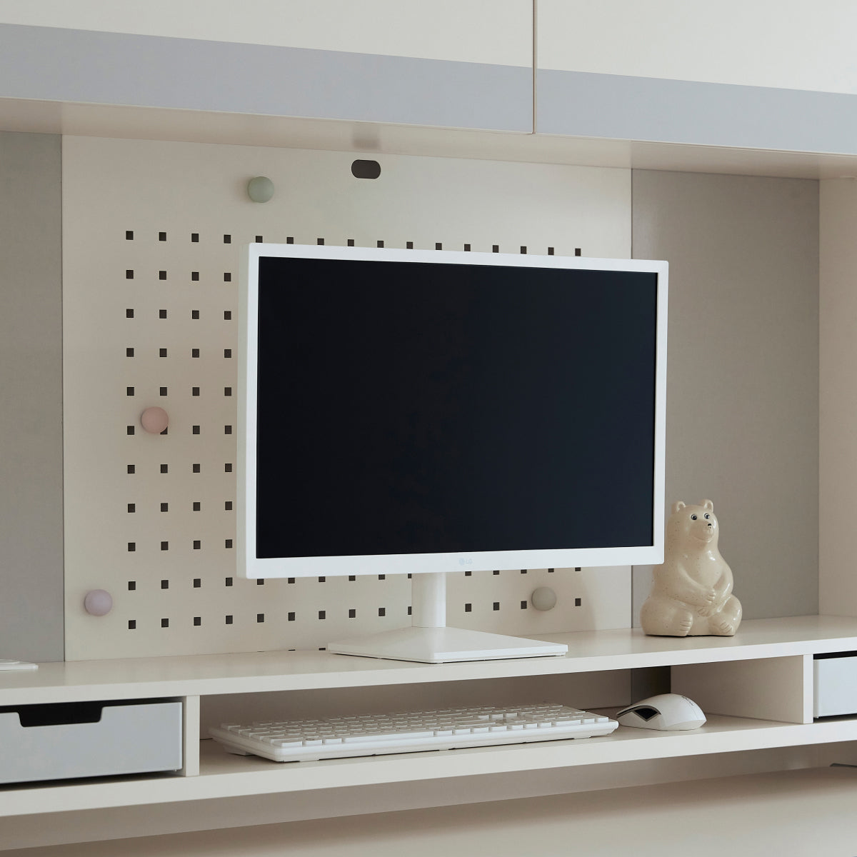 層板上方放置電腦螢幕 , 讓孩子以適當的距離及高度使用電腦 ;