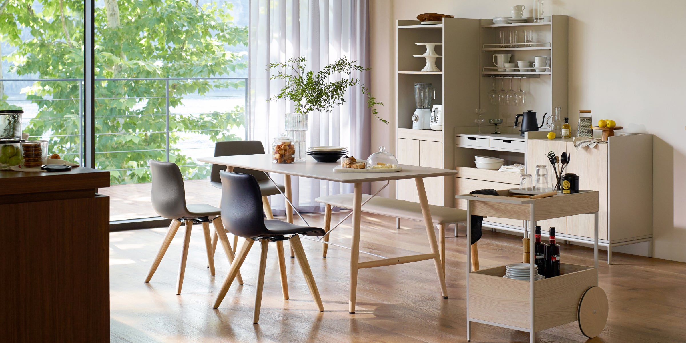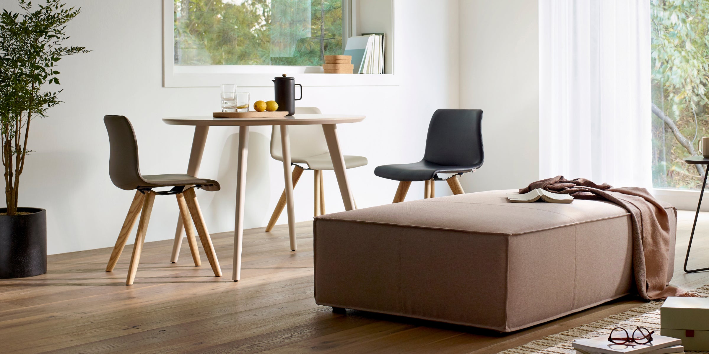 近似水滴造型的圓潤曲線 , 搭配圓形原木椅腳設計 , 給予空間柔和感的SETA Plus多功能椅 , 從餐桌到書房 , 多樣化的搭配展現空間明亮風格。