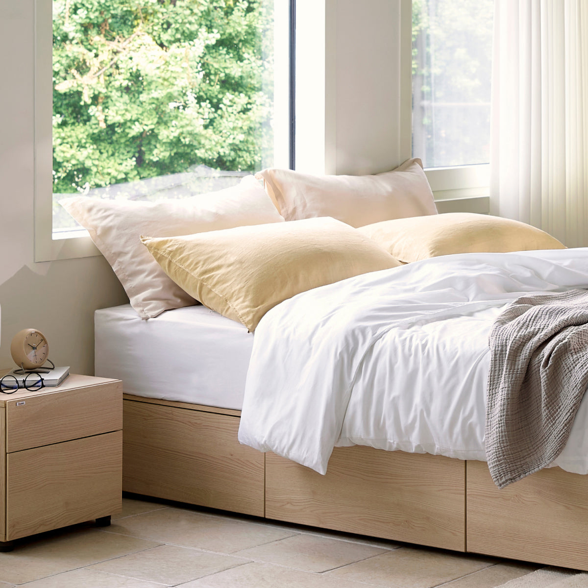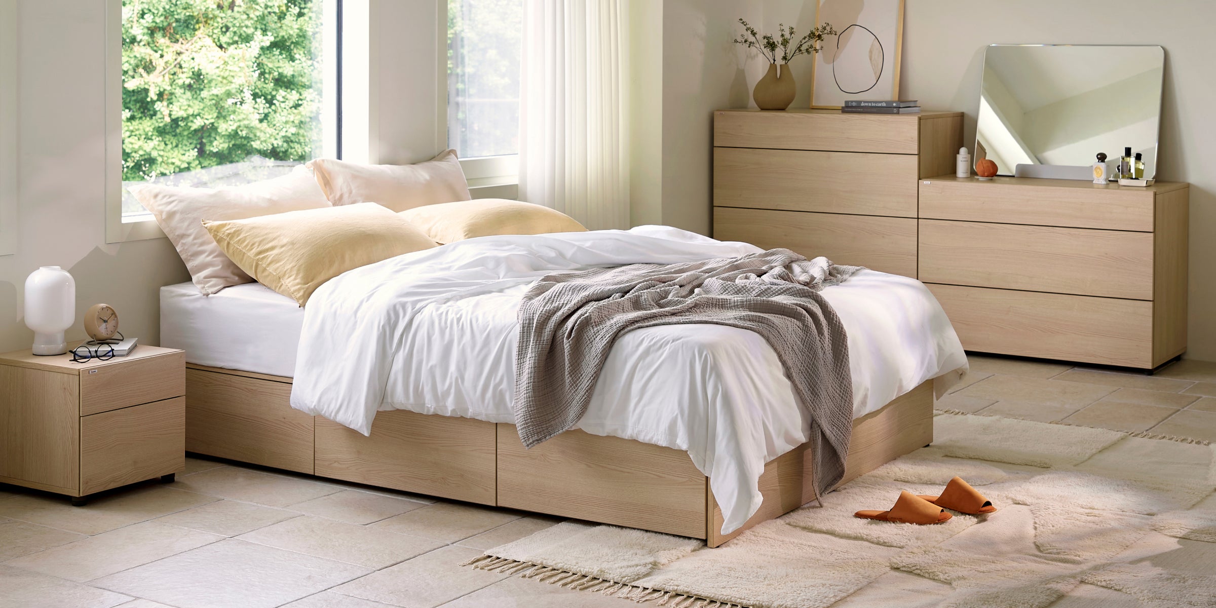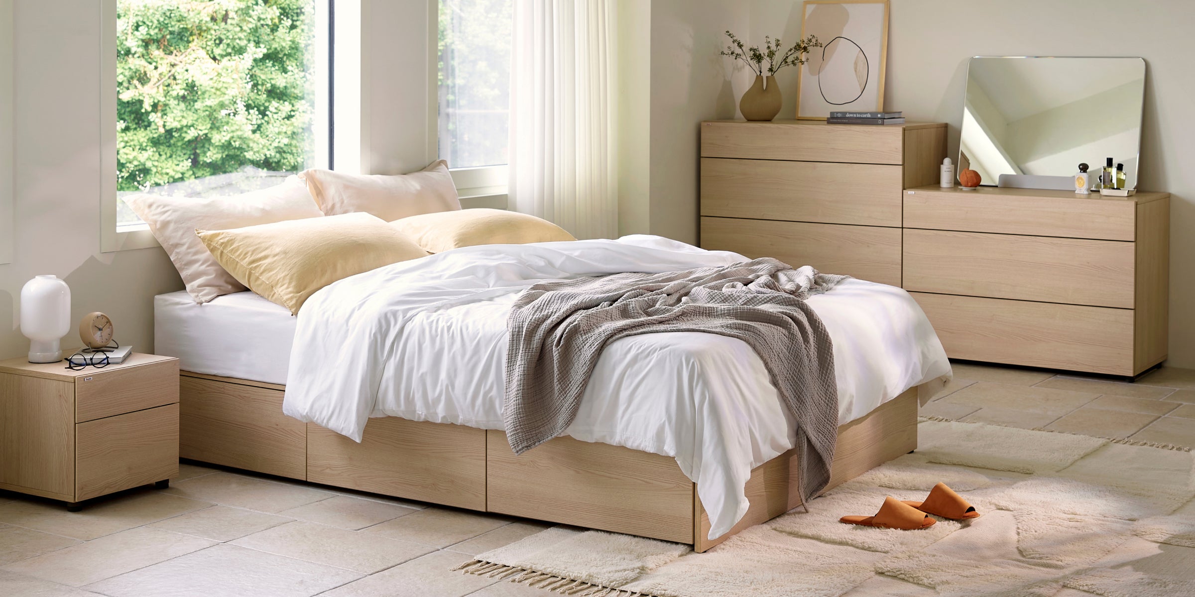 一張既寬敞且舒適 , 同時兼具實用功能的床架 床頭板和抽屜設計 , 提供更為愉悅的睡眠和收納體驗